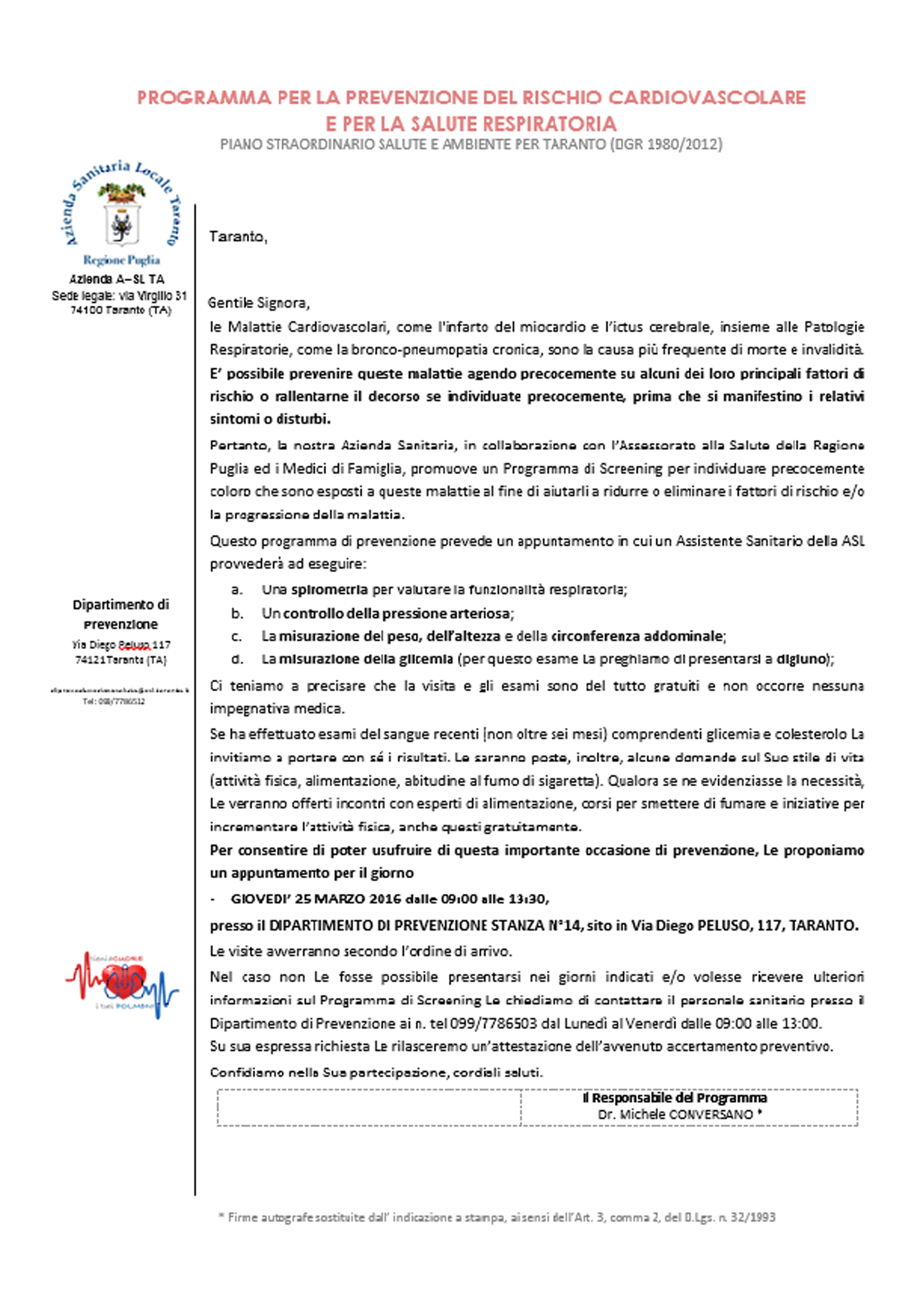 Il cittadino è invitato a prendere parte al programma di prevenzione con una lettera che gli viene inviata a casa. Nell’invito sono indicati giorno, ora e luogo dell’appuntamento oltre ovviamente ad una descrizione dell’iniziativa alla quale è stato invitato a partecipare. Nella stessa lettera è indicato un numero di telefono al quale fare riferimento se si intende spostare il giorno dell’appuntamento o se si ha semplicemente necessità di ricevere ulteriori informazioni.